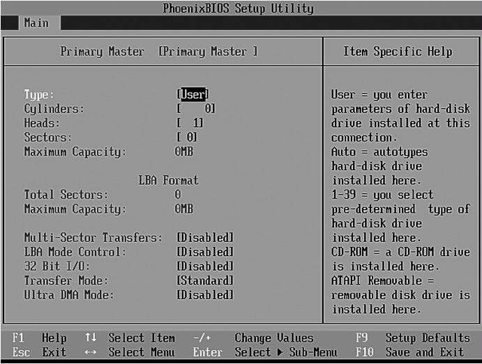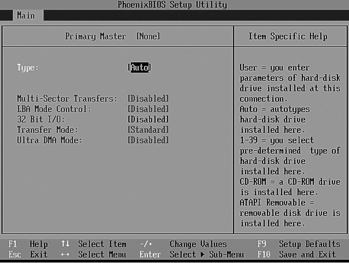 Хотя в некоторых случаях можно установить дополнительные параметры. Primary Master, Primary Slave, Secondary Master, Secondary Slave – это тип подключения жесткого диска (или другого IDE-накопителя) к шине. Вы можете задать отдельные параметры для каждого жесткого диска, но сначала нужно определить, как он подключен к шине. Более подробно мы это обсудим в следующей главе, а сейчас просто поговорим о параметрах Setup. Выберите произвольный жесткий диск и нажмите Enter. Вы увидите список параметров для выбранного жесткого диска (рис. 5.2).
