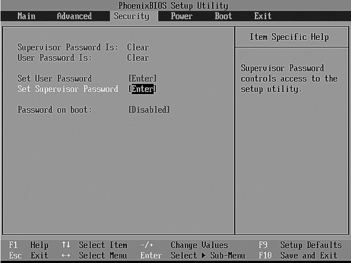 В разделе Security (рис. 5.4) вы можете установить пользовательский пароль (user password) и пароль администратора (supervisor password). Пароль администратора запрашивается только при входе в Setup и дает право заходить в Setup и изменять параметры компьютера. А вот пароль пользователя позволяет только загружать систему; его следует вводить, если включен (Enabled) параметр Password on Boot.