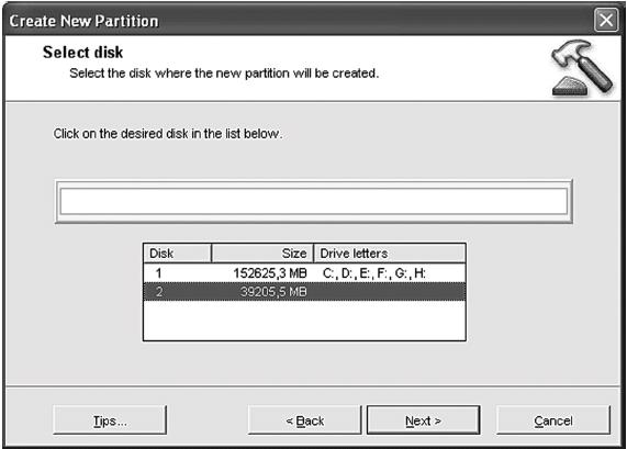 Рассмотрим, как создать раздел. Выбираем команду Create a new partition. Откроется мастер, позволяющий выбрать диск, на котором вы хотите создать новый раздел (рис. 6.9).
