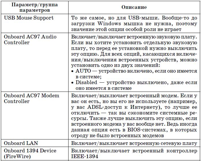 В группе Integrated Peripherals находятся параметры, влияющие на работу встроенных периферичных устройств – интегрированной звуковой платы, сетевой карты и т. д. Опции данной группы представлены в табл. 5.4.