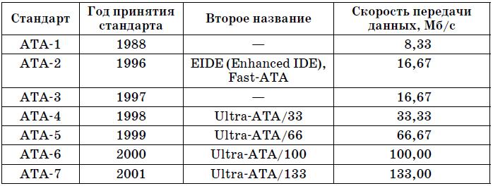 Интерфейс ATA постоянно совершенствовался, на данный момент есть несколько его разновидностей, оформленных в виде стандартов (табл. 6.1).