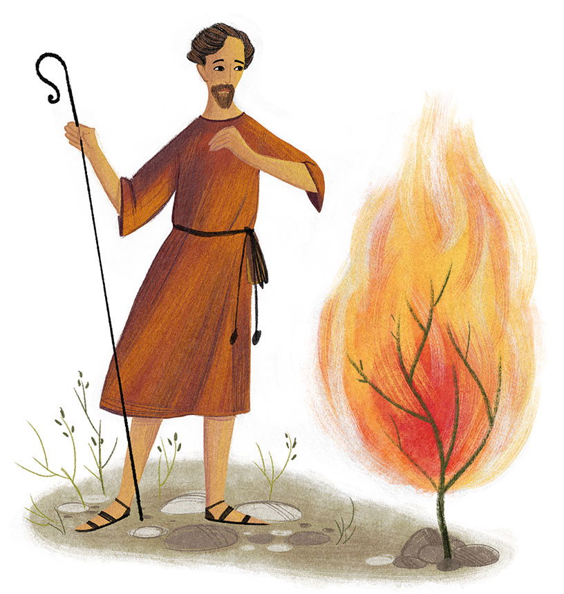 Однажды, когда Моисей пас стадо, он отошёл немного дальше, чем обычно, и пришёл на гору. Там он увидел перед собой большой горящий куст, который пылал, пылал, но всё никак не сгорал. Он подошёл, чтобы рассмотреть куст поближе, и услышал голос Господень, который обращался к нему: