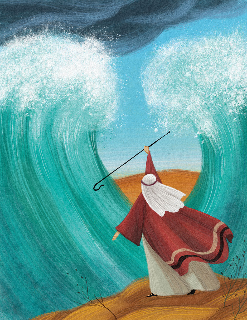 Когда евреи услышали вдали грохот приближающегося египетского войска, они встревожились ещё сильнее, но Господь сказал Моисею: «Протяни свой жезл над водами морскими и встань во главе своего народа: воды разойдутся, и вы сможете пройти». Моисей сделал, как ему было сказано, и тут же поднялся восточный ветер, разделивший воды, и посреди двух водяных стен образовалась полоса суши. Его народ двинулся в путь, но египтяне приближались, и когда сыны Израилевы благополучно дошли до противоположного берега, преследователи тоже вступили на сушу посреди вод морских. Тогда Господь снова обратился к Моисею: «Теперь, когда все твои люди перешли море, обернись и протяни руку над водами». Моисей подчинился, и воды вернулись на место, потопив колесницы, солдат и всё войско вместе с фараоном. В тот день Израиль спасся и увидел могущество Господа своего.