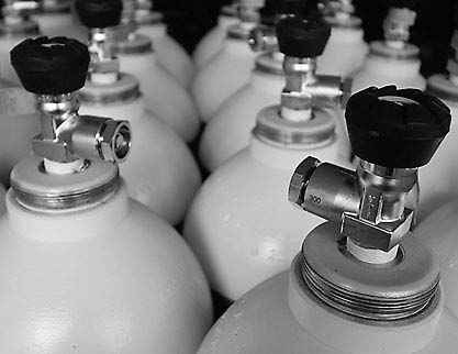Баллоны с газами под высоким давлением представляют определенную опасность, поэтому их хранят в строгом соответствии с правилами техники безопасности. Их нарушение может обернуться крупными неприятностями. Например, для смазывания вентилей баллонов с кислородом ни в коем случае нельзя использовать смазки на основе углеводородов: их реакция с кислородом, находящимся под высоким давлением, может привести к взрыву. Опасность представляет и водород, который используют во многих химических лабораториях. Ведь если вентиль плохо закрыть или он испортится, в помещение может попасть много водорода, который с воздухом образует взрывчатую смесь. Баллоны со сжатым водородом для безопасности прикрепляют с помощью специальных хомутов к стене или даже выносят во двор; в последнем случае газ поступает в лабораторию по тонкой металлической трубке.