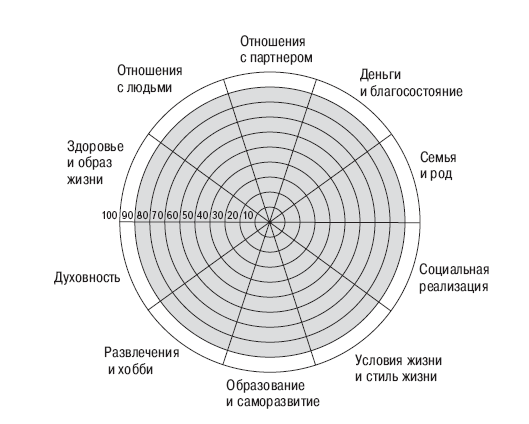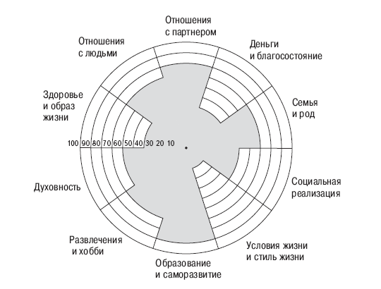 Также вы можете нарисовать колесо своего жизненного баланса, проставив в каждой сфере по 10-балльной шкале оценки своей удовлетворенности. Это наглядно покажет вам, какие из них развиты хорошо, а с какими стоит поработать.