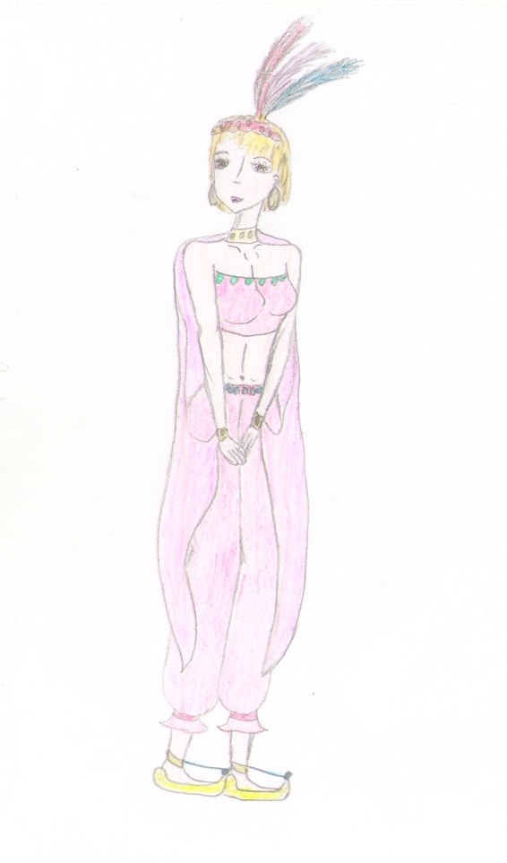 Рядом с ней пристроилась молодая девушка, коротко стриженная, симпатичная, но… Бэкки уставилась на неё, позабыв о своих печалях и открыв от изумления рот. Удивиться и впрямь было чему. Девушка явно не здешняя, уж больно диковинный на ней был наряд. Розовый топ, отделанный бриллиантами и такие странные широкие присобранные на щиколотках штаны. Тонкую белую шею незнакомки обнимало широкое ожерелье, выглядевшее довольно массивным. Бэкки даже испугалась – не переломит ли оно хрупкую шею девушки. От ожерелья до самой земли был спущен прозрачный шлейф, концы которого были прицеплены к браслетам на узких запястьях. На голове удивительной незнакомки блестела маленькая корона с разноцветными перьями.