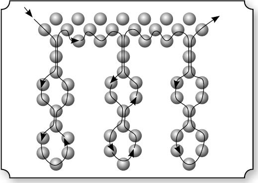 Вариантов соединения цепочек очень много. Их можно соединять по всей длине или через определенные промежутки, закрепляя нить, а затем вплетая ее вновь либо двигаясь через крайние бисерины цепочек и набирая на нить бисер, соединяющий ряды (рис. 32).