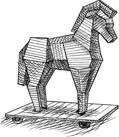 – Давайте, – сказал он, – сколотим большого деревянного коня и посадим в него отряд воинов. А сами заявим троянцам, что признаем свое поражение, уплываем восвояси и на память о нашей войне оставляем на берегу этого деревянного коня ростом с трехэтажный дом – так сказать, не поминайте лихом!