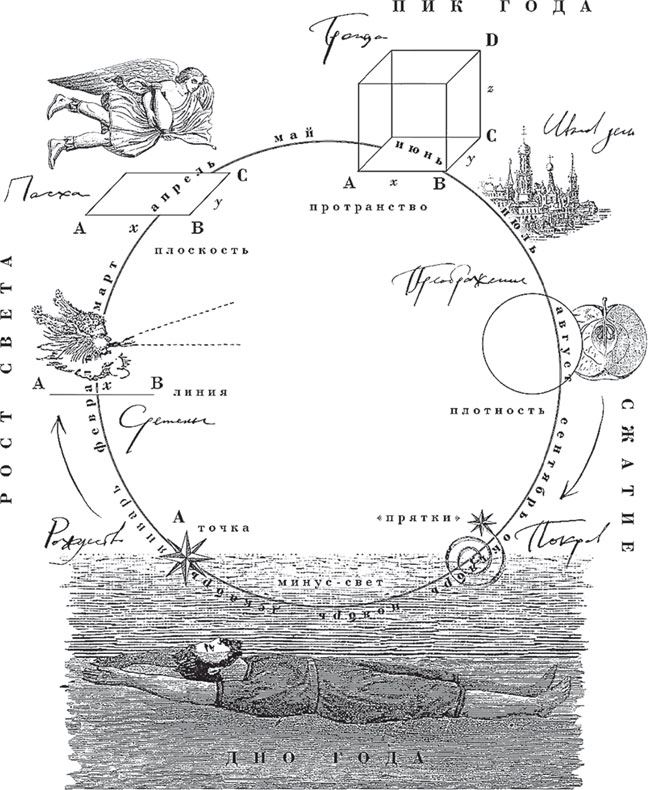 Это самое важное приобретение в исследовании московского календаря. Не так важно, что «идеальный» сюжет роста и сжатия года счастливым образом замыкается, – мы рисовали его сами, притом достаточно свободно. Гораздо важнее то, что, сочиняя, мы постепенно московским образом меняемся сами.