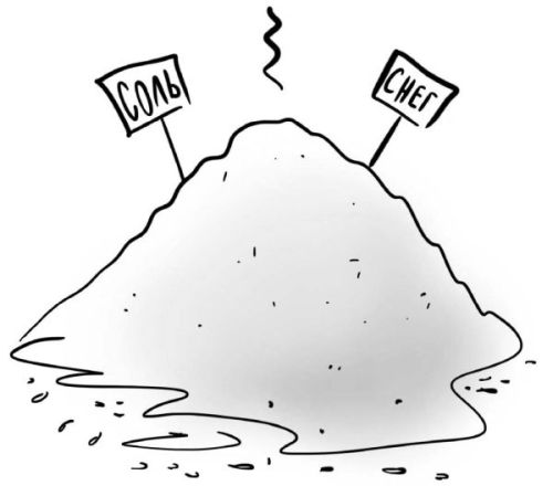 Это мы поговорили про жидкость, которая переходит в газообразное состояние. Но бывает еще, когда что-то твердое превращается в жидкость. Этот процесс тоже сопровождается снижением температуры. Так вот, соль заставляет снег таять. Он из твердых кристаллов превращается в жидкость. Пока идет процесс таяния, эта смесь охлаждается. Может быть, даже до –20 °C! Мало того, что льдинки тают, так и сами кристаллики соли растворяются. Процесс растворения тоже сопровождается понижением температуры.