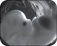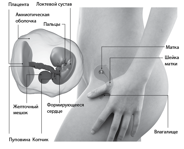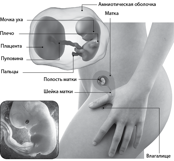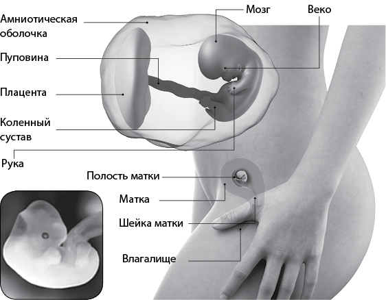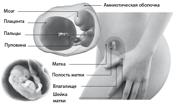 Теперь эмбрион называют плодом. Его головка составляет половину длины тельца, а лицо уже похоже на человеческое. Малыш двигается, может отталкиваться от стенки матки, подносить ручку к лицу, открывает и закрывает ротик, глотает. Его пальчики уже полностью разделены, на них формируются крохотные ноготки. Печень малютки вырабатывает кровяные клетки, это значит, что желточный мешок свою миссию выполнил, он больше не нужен и будет постепенно отмирать.