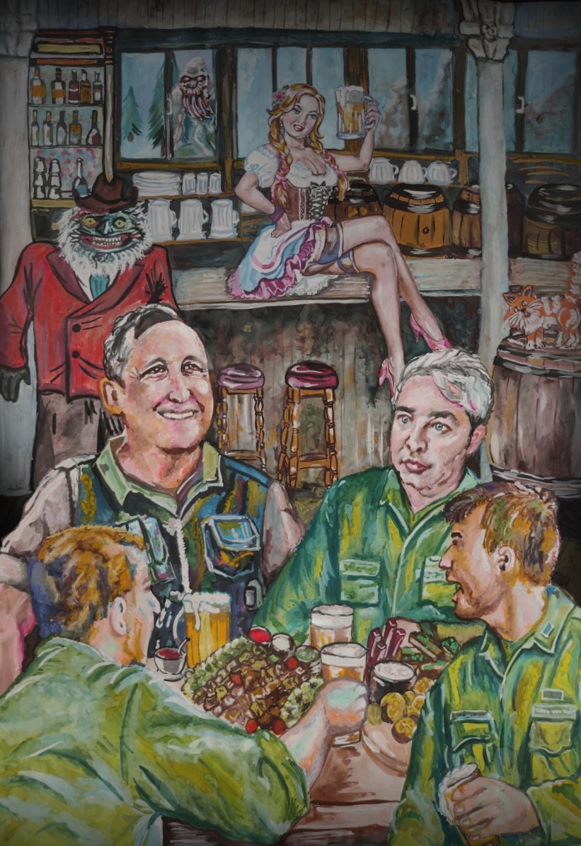 – Гуд! – констатировал данный факт Процессор. – Фрау Марта, нам, биттэ, как всегда. Зер шнеллер принесите нам две литровых водяры, жареных колбасок «по–баварски», четыре рульки, салатов каких–нибудь там, ну и кружку светлого пива для вот этого интеллигентного седого мужчины.