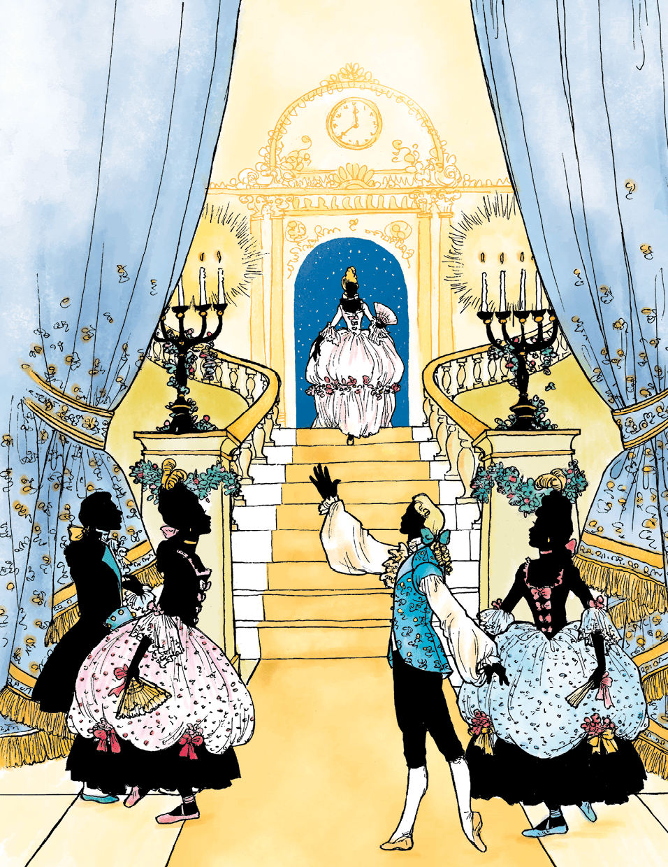 В высоких парадных дверях на фоне ночного неба стояла Золушка в своём сверкающем волшебном платье. При виде стольких обращённых к ней лиц ей захотелось убежать. Но она пересилила себя, глубоко вздохнула и, успокоившись, медленно спустилась в зал.