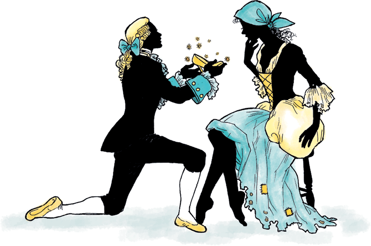 Когда танец кончился, принц распорядился подать угощение. Слуги принесли серебряное блюдо с апельсинами – самыми редкими фруктами в его королевстве. Он предложил один Золушке, а затем угостил и сестриц, дал им тоже по апельсину. Пока они ссорились из-за того, кому достанется апельсин побольше, принц и Золушка тихонько отошли в сторону.
