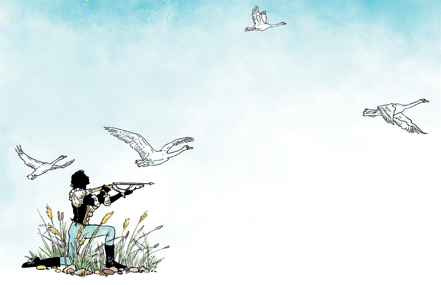 – Скорее! За этими лебедями! – воскликнул он, вскакивая на ноги и хватая свой арбалет.