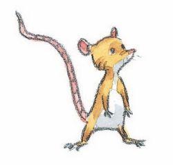 Руфус остановился как вкопанный и принялся лаять на стену. Когда Маркус и Марианна подошли к нему, они поняли, в чём дело. На настенной полке на задних лапках сидел маленький светло-коричневый мышонок. Похоже, он был очень напуган.