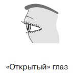 Тип глаза. «Открытый»: глаз широко открыт, взгляд направлен в упор на слушателя. Брови сильно изогнуты и опускаются к виску. Ресницы загнуты круто кверху.