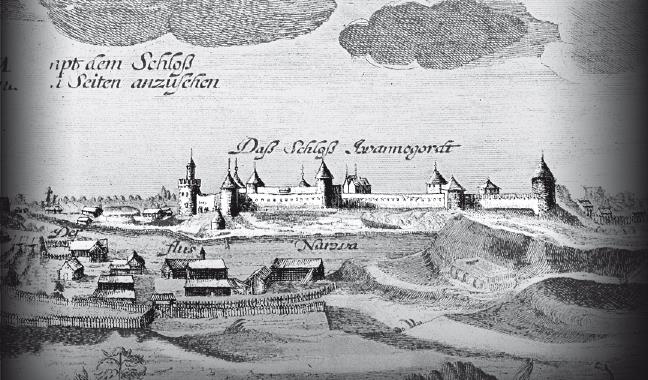 Вид реки Нарвы и замка Ивангород с лифляндской стороны. Гравюра из «Путешествия» Адама Олеария. XVII в.