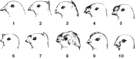 1 – бесчубый; 2– острочубый («хохолок»); 3 – чуб раковинообразный («капюшон»); 4– носочубый («челка»); 5– носочубый («роза»); 6 – носочубый («свечка», «хохолок»); 7 – двучубый («с челкой и капюшоном»); 8 – двучубый («с розой и париком»); 9 – с бровями; 10 – с усами и бакенбардами