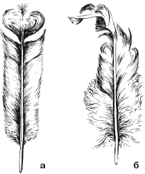 а – конец опахала рулевых перьев расщеплен («кружева», «бахрома»); б – у мелких перьев на щитках и на теле опахала в форме локона как бы завитое или расщепленное («курчавое»)