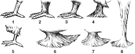 1 – неоперенная нога; 2 – плюсна оперенная, пальцы неоперенные («в штанишках»); 3 – плюсна и пальцы оперены короткими перьями (0,5–1 см) («в чулках»); 4 – плюсна и пальцы оперены перьями длиной 2–3 см («чулки в колокольчик»); 4а – ястребиные перья; 5 – плюсна и пальцы оперены перьями длиной 4–6 см («малые космы»); 6 – плюсна и пальцы оперены перьями длиной 1-10 см и более («космы в тарелку»); 7 – на голени и брюшке торчащие мелкие перья («штанишки» или «шорты») у китайских чаек; 8 – плюсна и пальцы коротко оперены перьями длиной 2–3 см («чулки в блюдце») у английских дутышей