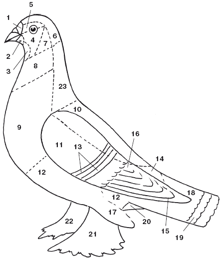 1 – лоб («кокарда»); 2 – подклювье («бородка»); 3 – горло («борода»); 4 – щеки; 5 – брови; 6 – теменная полоса; 7 – околоушная часть («сережки»); 8 – шея; 9 – грудь; 10 – спина; 11 – кроющие перья крыла («щиток»); 12 – брюшко; 13 – пояса; 14 – надхвостье; 15 – первостепенные маховые первого порядка; 16 – второстепенные маховые второго порядка; 17 – ястребиные перья («откос»); 18 – рулевые хвоста («хвост); 19 – лента; 20 – подхвостье («клин»); 21 – космы; 22 – чулочки; 23 – грива