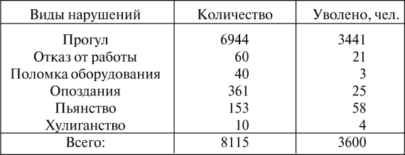 Отмечались факты сокрытия прогульщиков, огромное количество административных отпусков, в основном оформленных задним числом. Имело место принятие рабочих и служащих на работу в обход приказов директора и даже отдела кадров. Одним из доказательств наличия на предприятии нелегальной рабочей силы является большое расхождение между официальным числом работающих и числом пайков, запрашиваемых цехами. Порой оно достигало 5–7 %.[107]
