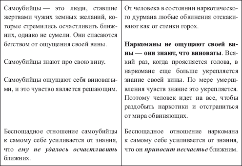 Меня очень часто спрашивают, как помочь наркоману. Ответ мой всегда один: помогите себе, тем самым поможете и ему. Кто помогает себе, тот понимает, что с наркоманией бороться нельзя. Если борьба с каким угодно отрицательным явлением ведет к усилению данной негативности, то борьба с наркозависимостью конкретного человека означает его быструю смерть. Причем очень скоро умирает тот наркоман, борющиеся за которого люди доказывают свою любовь в глазах общественности тем, что выискивают виновных, которых необходимо сурово покарать. Запомните, если вы действительно желаете помочь наркоману, то нельзя в его присутствии осуждать кого бы то ни было. Любое порицание, любую критику, любое осуждение в чей бы то ни было адрес наркоманом воспринимается на свой счет, ибо он сам – мишень обвинений. Не забывайте – все проблемы коренятся в семье. Если вы из тех родителей, кто ищет виновных, значит, вы ищете, как наказать себя. Ваш ребенок может и не знать о том, о чем я говорю, однако он это чувствует. Если он хоть сколько-нибудь вас любит, то скорее умрет, чем станет вас обвинять. И себя тоже не осуждайте. Для вашего ребенка это тоже непереносимо. Признайтесь ребенку, что вы не сумели его понять, поскольку и себя-то не понимаете. Поверьте, со временем он это поймет. Когда не будет уже причины бояться своей семьи, тогда поймет.