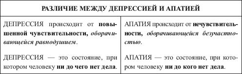 Апатия – это такое состояние, при котором человеку нет дела ни до кого. Кого он искренне любил, тот перестает для него существовать, не говоря уже о вечно им недовольных и осуждающих согражданах. Апатия делает человека глухим ко всему живому и в первую очередь к самому себе. Если он превратил себя в предмет или машину-автомат, то он и подавно не испытывает к себе никаких чувств. По сути дела, чем глубже апатия, тем тело менее подвержено болезням. Из-за утраты чувствительности человек становится невосприимчивым к травматической боли, чем удивляет окружающих, возводящих его в ранг стоических героев.