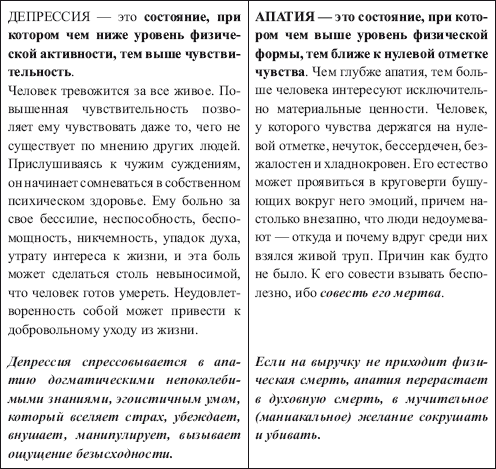 Апатия– это балансирование на грани жизни и смерти. Чем апатия глубже, тем чаще человек задумывается о том, что лучше умереть, чем лишиться рассудка. Смерть внемлет ему и приходит на помощь, если иначе уже нельзя. Происходит это в ту минуту, когда апатия человека уже настолько свела с ума окружающих, что его собственный мыслящий эгоистически мозг утрачивает свою функцию.