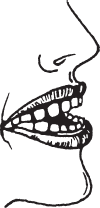 Прогнатия (рис. 3) – аномалия прикуса, связанная с выступанием вперед верхней челюсти (греч. pro – вперед, gnathos – челюсть). Данная аномалия, как и следующая, более всего сказывается на произнесении свистящих и шипящих звуков, для которых необходимо наличие лишь очень небольшого расстояния между верхними и нижними резцами (в противном случае не удается достигнуть эффекта свиста или шипения).