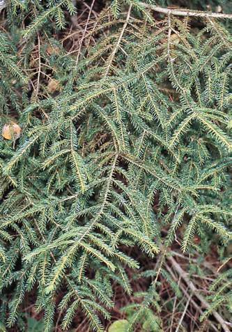 Хвоя. Мелкая, всего 4–8 мм длиной, жесткая, колючая, темно-зеленая, блестящая, сплюснуто-четырехгранная, расположена вдоль побега.