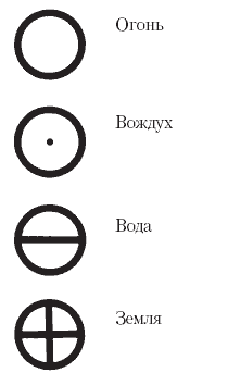Западная традиция, испытавшая влияние древнегреческой философии, в качестве «кирпичиков» мироздания рассматривала четыре элемента (стихии): Огонь, Землю, Воздух (аналог Металла) и Воду. Но иногда к ним добавляли и пятый элемент – Эфир, или квинтэссенцию духа. Символические обозначения этих элементов приведены на рисунке. Элементы мироздания играли очень важную роль в мистицизме Средних веков, и там они имели другие обозначения (в форме круга – см. рисунок).