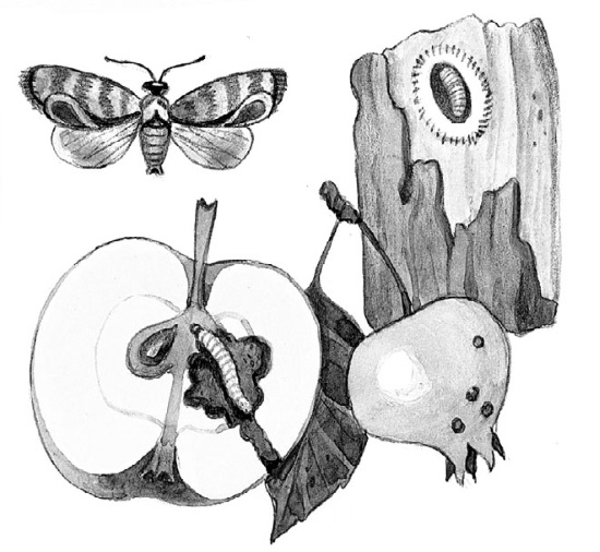 Гусеница, отрождаясь из яйца, прогрызает вход и затыкает его после себя собственными экскрементами, а иногда и заклеивает входное отверстие листочком. Ее цель – молодые семена, поэтому она быстро прогрызает себе путь в мякоти плода прямиком к семенной коробке. Съев 2–3 семечка, гусеница возвращается по своему же ходу наружу и перебирается в следующее яблоко. Поскольку цель дерева – вырастить свое потомство – семена, а вовсе не нарастить вокруг семенной коробочки мясистый плод, то яблоня сбрасывает поврежденное яблоко. Гусеница обычно падает на землю вместе с яблоком и снова возвращается на дерево, чтобы продолжить трапезу. Иногда она самостоятельно опускается на землю на собственной паутинке, и это вместо того, чтобы попросту перебраться на соседний плод!