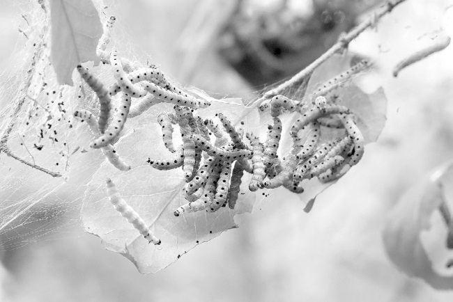 Развивается моль в одном поколении. Собирать и сжигать паутинные гнезда на взрослых яблонях невозможно, а вот окурить яблони табачным дымом следующей весной рано поутру еще до распускания почек – дело реальное. Можно также при разворачивании листьев опрыскать деревья раствором биопрепарата Фитоспорин.
