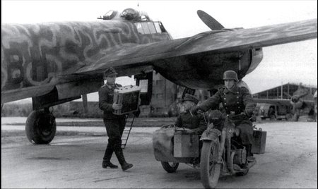 Курьер-мотоциклист ожидает кассету с фотопленкой, отснятой экипажем Ju-88T-1 «4U+BH» 1-й эскадрильи из Aufld.Gr. 123, Северная Италия, 1944 г.