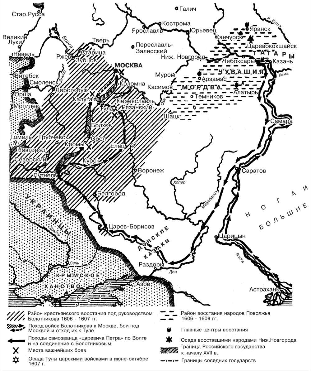БОЛОТНИКОВ ИВАН ИСАЕВИЧ (? –1608 гг.) – предводитель восстания в России в 1606–1607 годах. Беглый холоп. Вскоре восстание переросло в народную войну. Болотников называл себя воеводой «чудесным образом спасенного царевича Дмитрия». К восставшим присоединились южные и юго-западные области России, население Нижнего и Среднего Поволжья. В состав войска Болотникова входили крестьяне, горожане, стрельцы, казаки и дворяне, верившие Лжедмитрию I. Армия Болотникова несколько раз одерживала победы над высланными им навстречу царскими войсками Шуйского. Но 2 декабря 1606 г. при осаде Москвы восставшие были разбиты у деревни Котлы. Болотников отошел и укрепился в Калуге. На помощь к нему пришли отряды донских и украинских казаков. Не удержав Калугу, Болотников отступил и занял Тулу, где сдался после четырехмесячной осады. В октябре 1607 г. был сослан в Каргополь, где его ослепили и утопили.