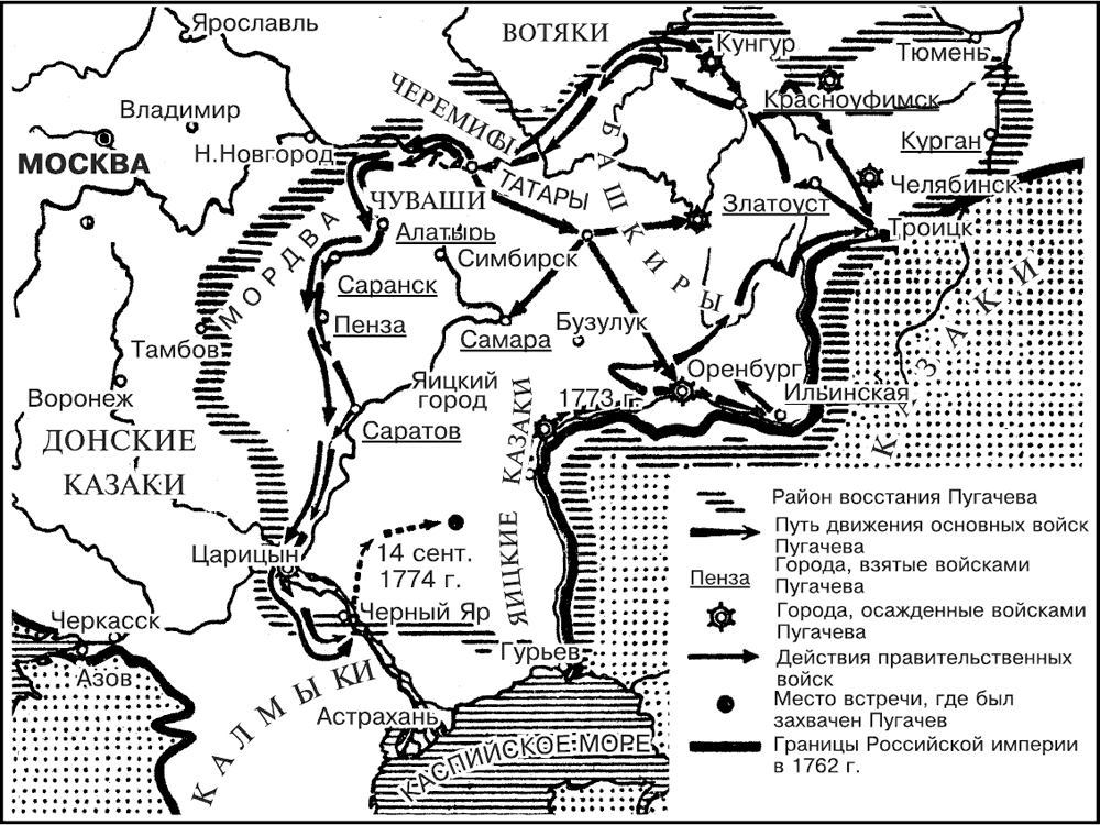 Война охватила все Поволжье и грозила перекинуться в центральные районы страны. Против Пугачева были двинуты отборные армейские части, в том числе и войска под командованием А. В. Суворова. Стихийность и локальность, характерные для крестьянских войн, облегчили борьбу с восставшими. Под ударами правительственных войск Пугачев отходил на юг, стремясь прорваться в казачьи районы Дона и Яика. Под Царицыном на пути к Черному Яру пугачевцы были разгромлены, а сам Пугачев попытался прорваться с небольшим отрядом на Яик. На полпути туда он был захвачен зажиточными казаками и передан властям. Началась жесточайшая расправа с восставшими. 10 января 1775 г. Е. И. Пугачев был казнен на Болотной площади в Москве.
