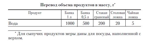Одним из основных требований, которые необходимо выполнять при консервировании продуктов, является точная дозировка составляющих рецептуры. Для удобства дозирования жидких и сыпучих компонентов можно воспользоваться данными таблицы. С помощью этой таблицы можно легко отмерить нужное количество по массе, используя стакан или столовую ложку, которые всегда есть под рукой.