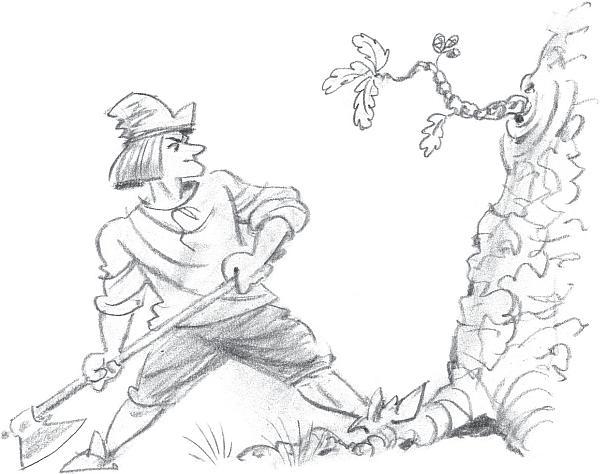 The farmer took his axe and started on his way. He went straight on for two days. At the end of the two days he came to a place where he saw a great oak which stood by itself and was higher than the other trees.