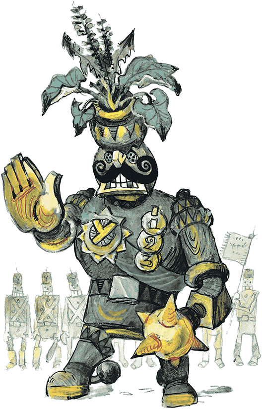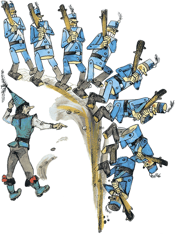 В одно злосчастное для них утро жители Когиды всполошились от сильного топота: это маршировала по улице деревянная армия Урфина Джюса. Впереди важно шагал палисандровый генерал с огромной булавой в руке, за ним шло войско с капралами перед каждым взводом.