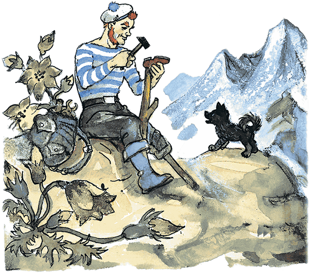 Затем он принялся за обувь: свой сапог и башмаки Элли он подбил шипами, чтобы они не скользили на скалах и на льду, а в деревяшку вбил крепкий гвоздь острием вниз. Для Тотошки моряк сделал прочные башмачки из мягкой древесной коры: лапки песика не будут зябнуть, когда он пойдет по леднику.
