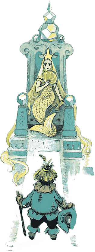 Страшила зашел в тронный зал и увидел на троне прекрасную Морскую Деву с блестящим рыбьим хвостом.