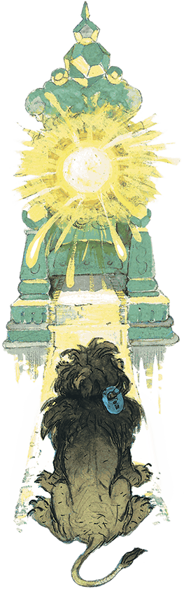 На следующее утро наступила очередь Льва идти к Гудвину, но когда он вошел в тронный зал, то отпрыгнул в изумлении: над троном качался и сиял Огненный Шар. Лев зажмурил глаза.