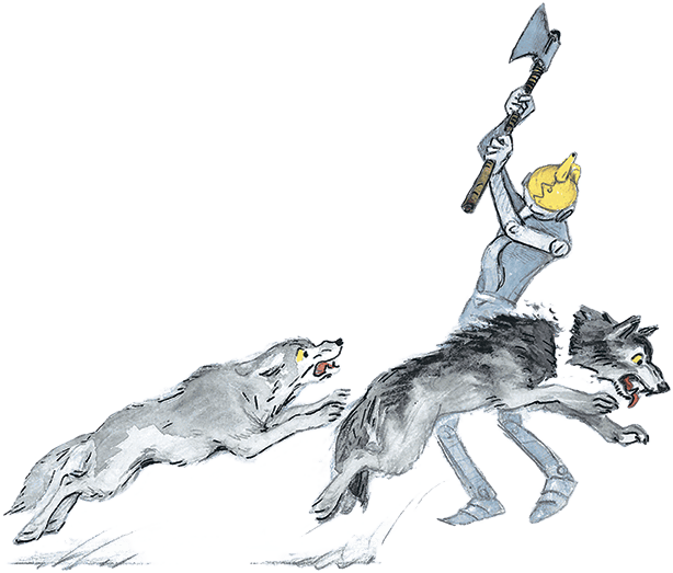 Сорок свирепых волков было у Бастинды, и сорок раз поднимал Железный Дровосек свой топор. И когда он поднял его в сорок первый раз, ни одного волка не осталось в живых: все они лежали у ног Железного Дровосека.
