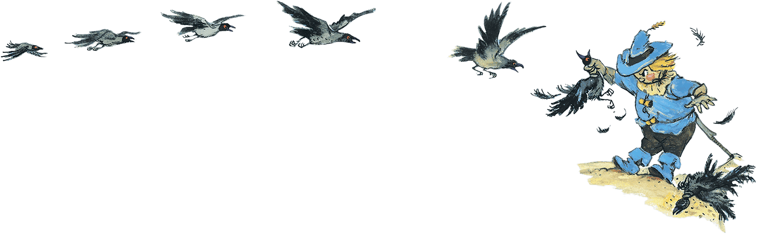 Вороны со злобным карканьем понеслись навстречу путникам. Завидев их, Элли перепугалась. Но Страшила сказал: