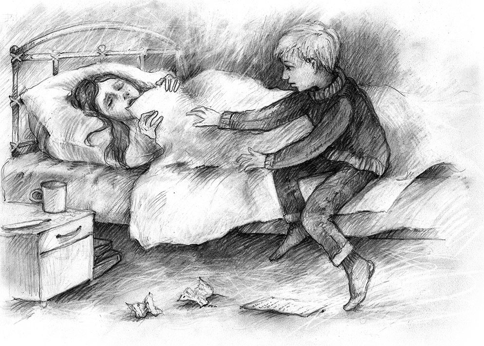 Он пробует мамин лоб, но тот очень горячий, можно даже градусник не ставить. Даниэль пытается её разбудить, чтобы дать таблетку, но мама не просыпается. Она дышит часто, иногда покашливая, и на каждом выдохе слышен свист.