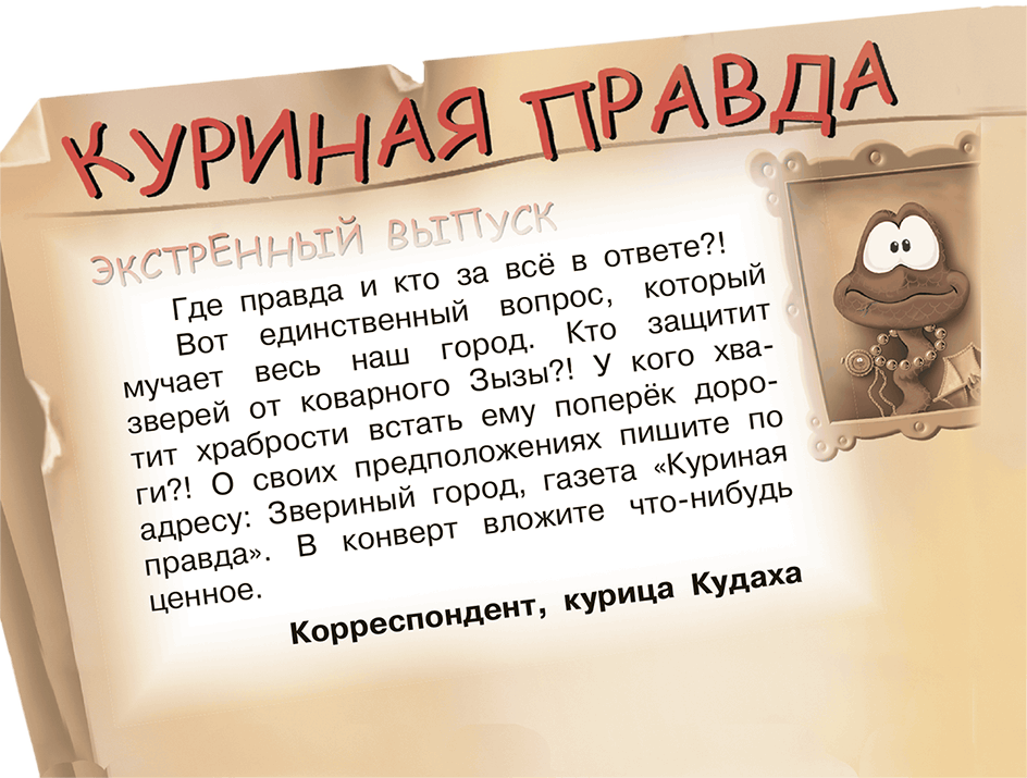 Куриная правдаНа город обрушился лунопад из падающих котов, которые имеют наглость называть себя суперкотами да Винчи и прочими гениальными именами. Где справедливость?! И чем мы хуже?! Мышь Зыза покидает город, но обещает вернуться!