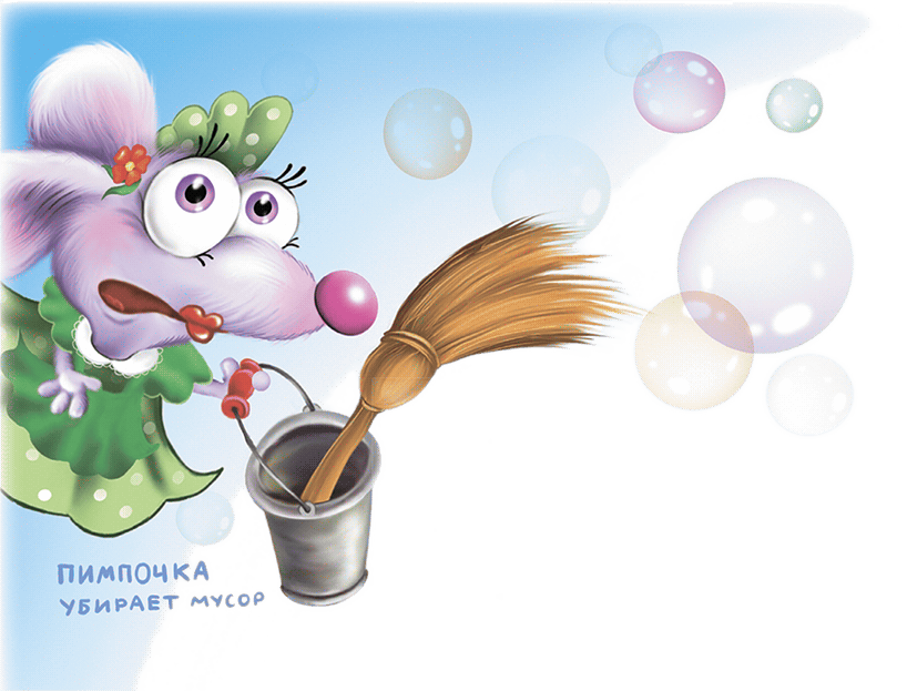 Пимпочка к концу праздника совсем устала. Ёжику вместо стакана молока налила ведро уксуса, а белке вместо плошки с орехами принесла кусок мыла на сковородке.
