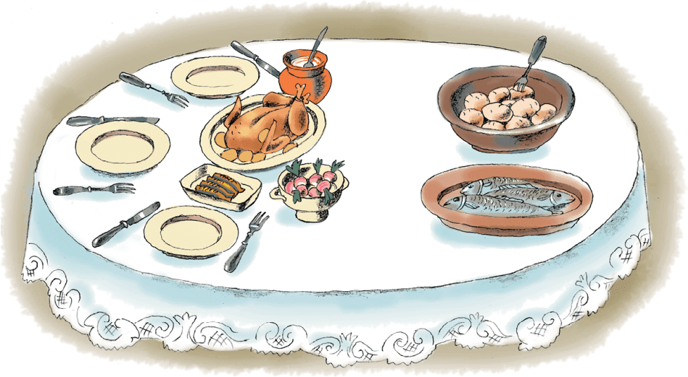 В детской Риты и Зои накрыт стол. Одна половина стола заставлена разнообразной едой. Тут первая бледно-розовая парниковая редиска, горшок со сметаной, сардины, отливающие жемчужно-опаловым блеском, пирожки, жареная курица, прижавшая под мышкой, как портфель, собственный пупок. На другой половине стола – несколько селедок в селедочнице и большая миска с вареной картошкой.